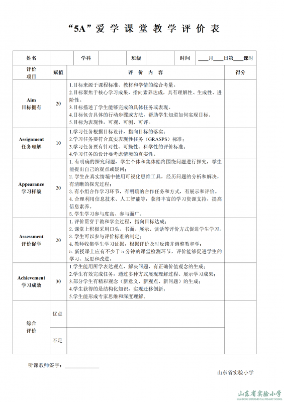 为进一步贯彻教育部《基础教育课程改革纲要(试行)》和《深化新时代教育评价改革总体方案》精神,及时准确地把握学校教育教学质量情况,引导教育教学改革健康协调发展,确保学校教学质量稳步提高,深入推进素质教育,进一步提升我校教育的影响力及竞争力,现根据我校教育教学现状,特制定《山东省实验小学教育教学质量评价制度》。