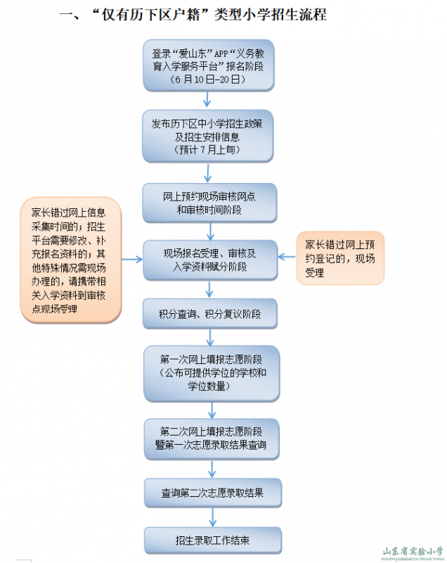 若以“仅有历下户籍”类型报名完成后,下一步还有入学资料现场审核预约、现场审核(赋分)、网上积分查询、网上志愿填报、网上录取结果查询等环节。请于7月上旬,通过历下区教体局官方网站(http://www.lixia.gov.cn/jyj/)和“历下教育”微信公众号查阅2025年历下区发布的中小学招生政策和招生指南,按照《2025年仅有历下区户籍类型小学招生须知》中公布的时间安排,做好下一步的相关事宜,并随时保持在招生平台登记的手机通讯畅通。