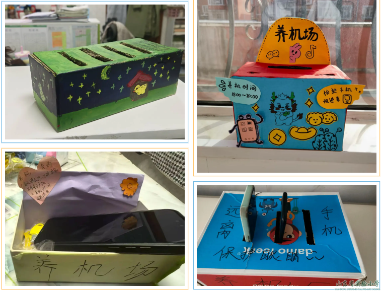 在家校协同层面,学校向全体家长发出倡议,呼吁家长做好家庭手机管理引导,与孩子共同制定家庭用机计划,以身作则减少非必要用机,多陪伴孩子参与亲子互动,营造“少用手机、亲近生活”的家庭氛围。同时,鼓励学生发挥创意,利用纸箱、瓶盖等废旧材料,动手制作专属“养机场”,既践行了环保理念,又为主动存放手机、培养自律习惯提供了趣味载体。