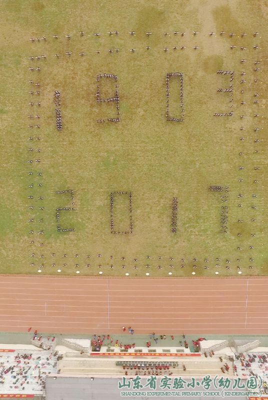 国旗队、花束队引领的各班方队朝气蓬勃、信心满满地走过主席台,展现了各具特色的班级文化。入场式结束后,五、六年级同学带来了学校老师自行创编的“山东省实验小学文明礼仪操”,在节奏明快的音乐伴奏下,同学们齐声背诵,一言一行、一举一动讲文明、传礼仪,动作舒展整齐划一,队形多变充满创意,集中展现了“人人有礼貌,个个懂礼仪”的校园文化。礼仪操最后,同学们摆出了“1903”“2017”的图案,致敬学校的百年历史,表达传承的坚定决心。表演过程中无人机升空,记录下这精彩的瞬间。