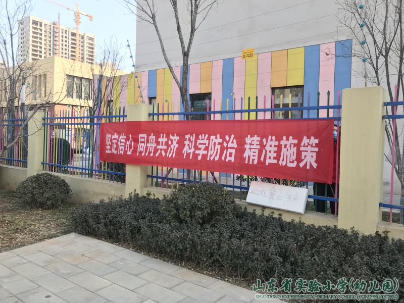 为此,幼儿园制作了多条醒目的疫情防控宣传条幅,在李宏彦主任带领下,和青年团员教师一起悬挂在幼儿园大门口的防护栏及围栏上。