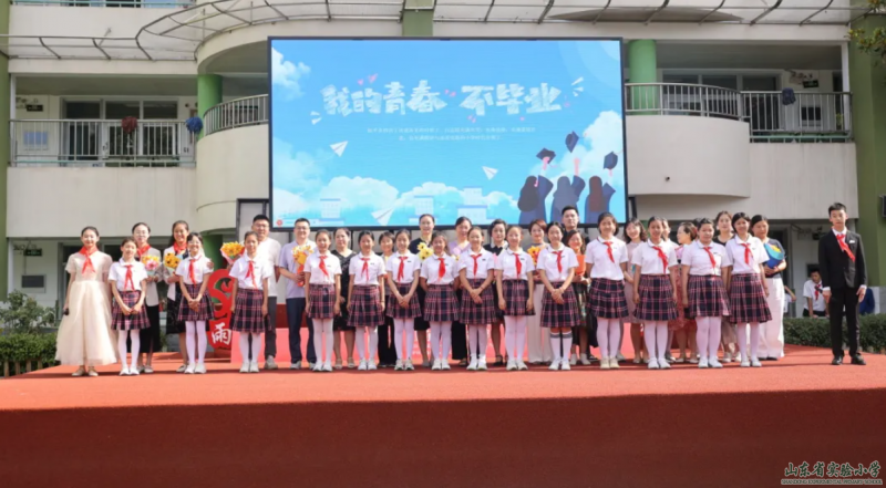 “当微风轻拂着校园的树梢,当阳光洒满了操场。还记得那初次踏入校园的懵懂,那充满好奇的目光。” 队员们饱含深情地朗诵,诗句里藏着初见时的胆怯、课堂上的争辩与课间的欢闹,让聆听者触摸到成长的纹路。随后,《明天,你好》的乐曲在草坪上跃动,少年们用旋转的裙摆剪碎离愁,用舒展的手臂拥抱远方,低年级队员也跟着节奏摆动双手,这场表演如同一封烫金的青春邀请函,在晨风中沙沙作响。