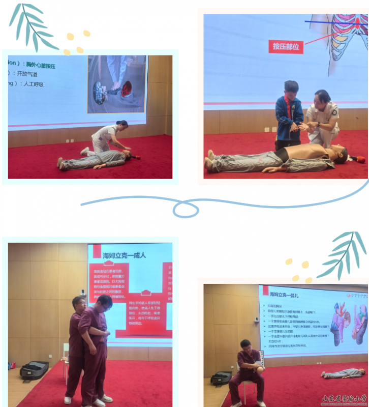 随后的“身体急救小超人——CPR 和海姆立克大揭秘”讲座中,邱老师用接地气的语言拆解专业知识,配合生动的现场演示,将心肺复苏(CPR)的按压位置、力度,以及海姆立克急救法的操作步骤清晰呈现。同学们全程聚精会神,不时举手提问、参与模拟操作,在轻松的氛围中掌握了两项关键急救技能,有效提升了应对突发状况的自救互救能力。